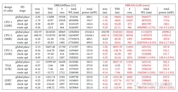 实验表明DREAM GAN不仅在放置阶段立即改善了主要的PPA指标,而且还证明了这些改进一直持续到路由后阶段,在路由后阶段,无线长度提高了8.3%,总功率提高了7.4%。