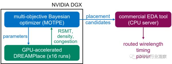 传统的分析布局引擎开发需要花费大量的精力用C++构建整个软件堆栈,因此,由于开发成本的问题,设计和验证新布局算法的门槛非常高。于是,英伟达利用深度学习工具包PyTorch,通过少量的软件开发工作,开发了一个新的具有GPU加速的开源布局引擎——DREAMPlace,这是一个比较出名的开源布局器。它通过高效的GPU实现的关键内核的分析布局,如电线长度和密度计算等。