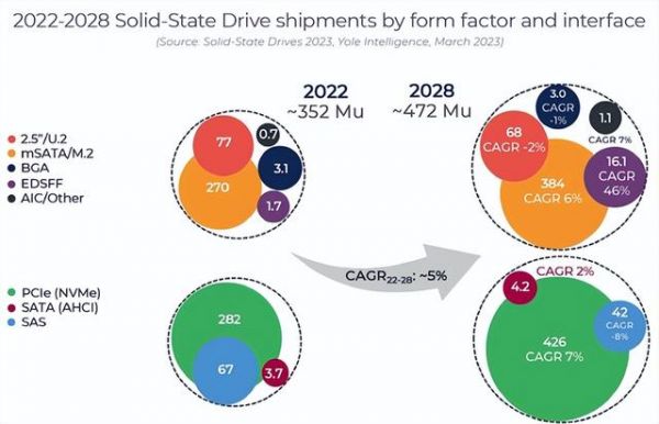 市场研究机构Yole Group的最新报告预计,到2028年,全球SSD出货量将达4.72亿块,总价值670亿美元,均价142美元,相比2022年分别增长34.1%、1.31倍、72.2%,年复合增长率达15%。