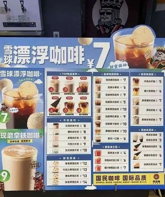 幸运咖全场均价8元,生椰拿铁10元,拿铁9元,而最便宜的美式仅5元,比有些矿泉水品牌还要便宜。