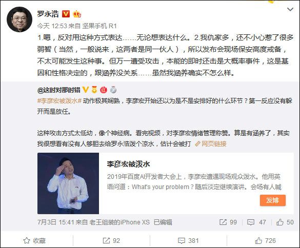 罗永浩称,我仇家多,还不小心惹了很多弱智(当然,一般说来这两者是同一伙人),所以发布会现场保安高度戒备,不太可能发生这种事。
