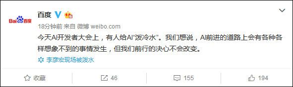 在3日上午10点左右泼水事件发生后,@百度 首先在微博做出简短回应:今天AI开发者大会上,有人给AI“泼冷水”。我们想说,AI前进的道路上会有各种各样想象不到的事情发生,但我们前行的决心不会改变。