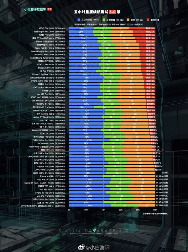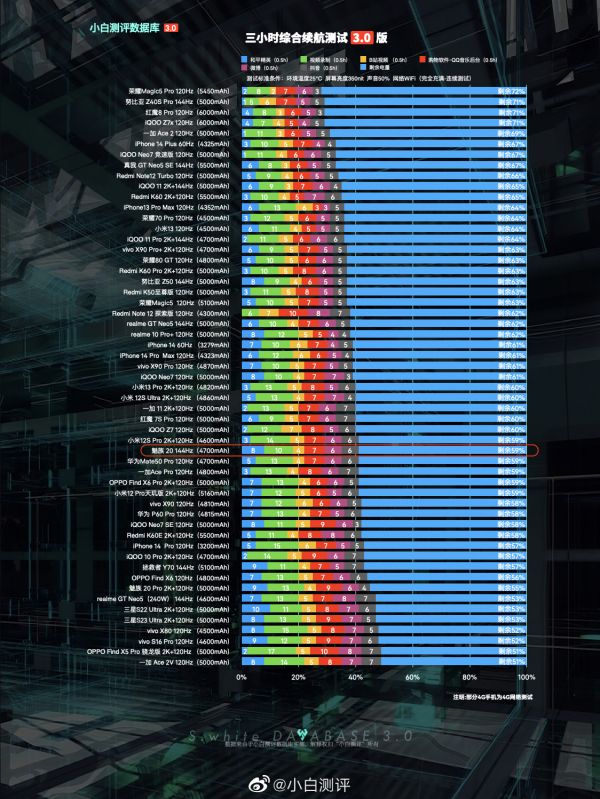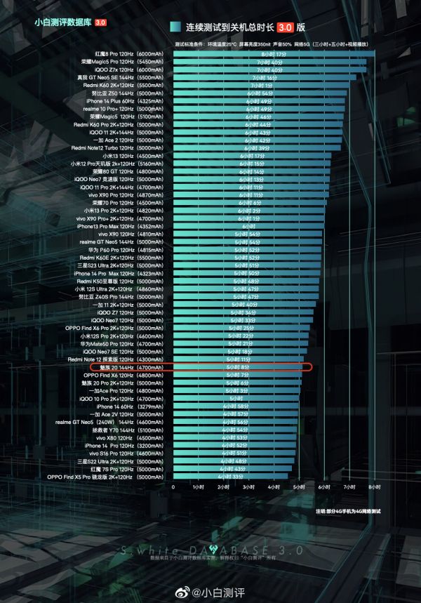 #小白测评数据库#3.0模型,测试标准条件:环境温25℃±0.5℃,屏幕亮度350nit,声音50%(数据基于 魅族 20 测试时最新版 Flyme 10.0.1.0A 系统测试)