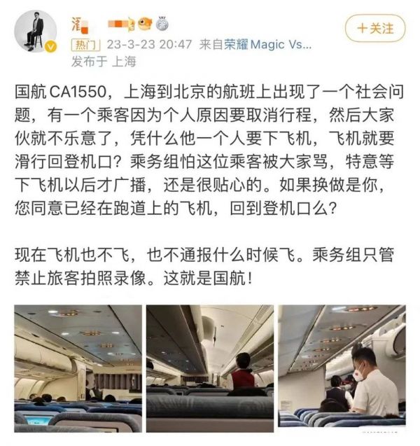 而国航机组在航班上的处理也值得商榷,既然飞机滑回不可避免,那就要做好善后解释工作,只是以“防止舆情”为由阻止旅客拍摄,那请问这舆情你们阻止了吗?怎么还愈演愈烈?