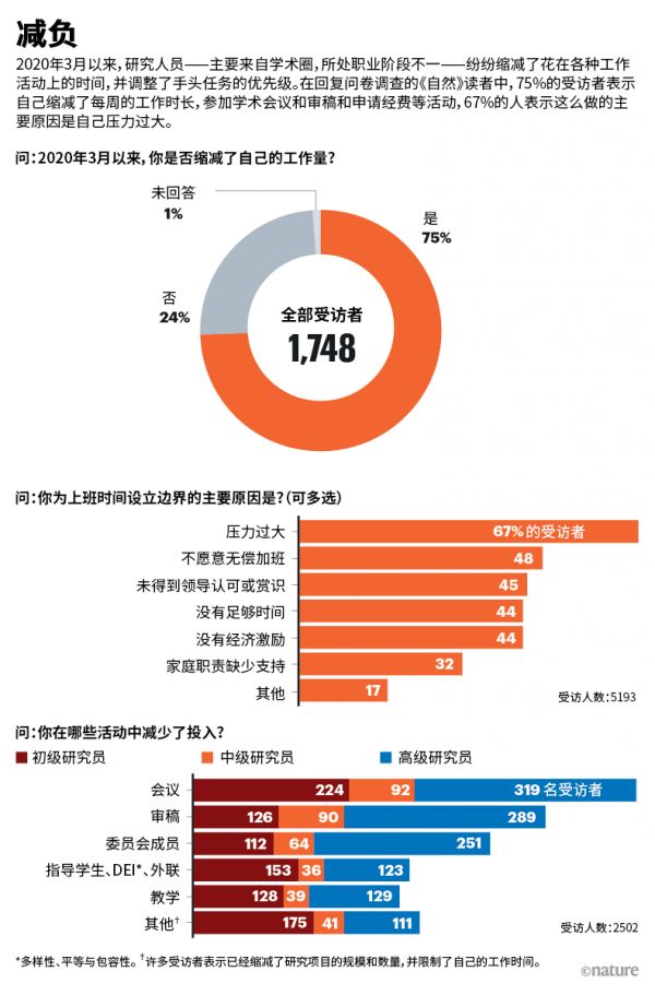 自新冠疫情开始,许多科学家压缩了工作时间,减少了在外部项目和活动中的投入。根据《自然》的问卷调查,在1748名自选答案的回复者中,75%的人自2020年3月以来削减了自己的工作量。大部分受访者为学术工作者(73%)、其他的来自工业界(9%)、政府(8%)、临床(4%)、非营利性机构(4%)和其他行业(3%)。受访者所处的职业阶段也不同:19%的为研究生或博士生;17%的为博士后研究员或科研助理;17%的为研究科学家或职工科学家;10%的为助理教授;22%的为资深教授或讲师;7%的为中高层管理人员;8%的为其他职位。