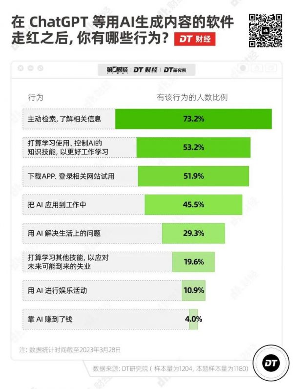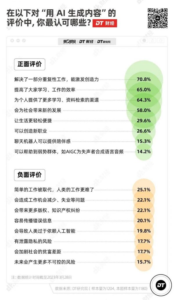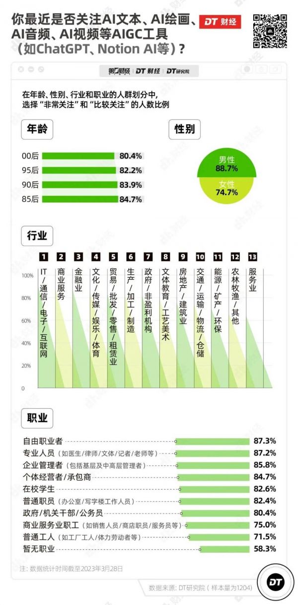 上周,DT财经联合第一财经发布了《“ChatGPT来了,你怎么看”小调研》,总共收到1204份回答,其中1180位朋友都表示自己有关注AI写作、AI绘画等AIGC工具。