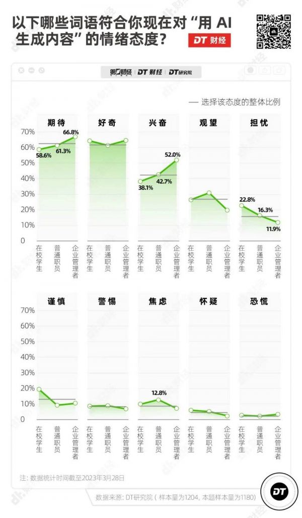 我们发现,对ChatGPT等AIGC的情绪态度与职场经验有关:基本上是按照在校学生-普通职员-企业管理者的顺序,在职场上的职级和话语权越高,对于AIGC越是期待和兴奋,而没有工作经验的学生群体感到担忧的比例明显更高。