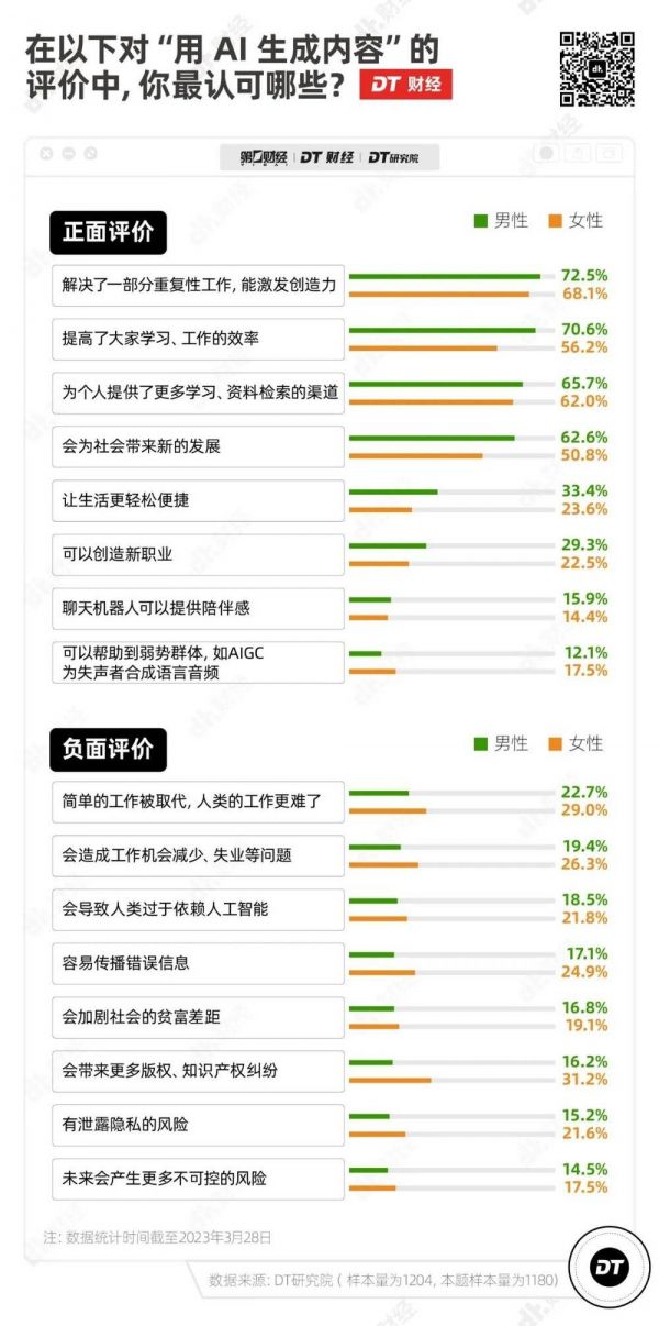 在对于AIGC的评价上,男性和女性有非常明显的区别:男性更认可AIGC在效率上的影响,女性更关注新科技带来的副作用。