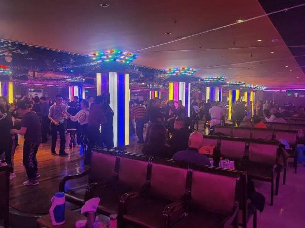已经进入舞厅的客人们,在热场音乐和迪斯科球变换的光线下换上鞋子,踩着舞步滑入舞池。