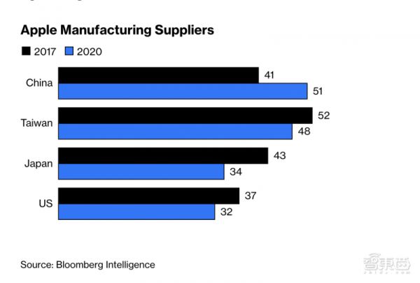 在苹果产业链转移过程中,具有标志性意义的事件是,2017年,苹果开始在印度生产低端iPhone。彼时,苹果并未削弱与中国的关系。Bloomberg Intelligence的研究发现,在2017年-2020年期间,苹果在中国的供应商数量有所增加,而其他国家的供应商数量则有所下降。