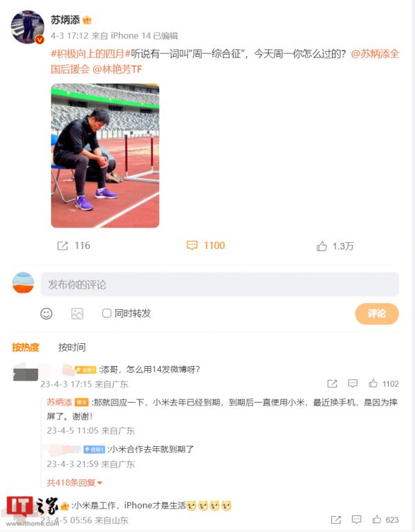 IT之家 4 月 6 日消息,田径运动员苏炳添近期发布了一条微博,不少IT之家网友发现该条微博的小尾巴已显示为 iPhone 14。