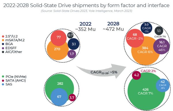 在 2022 年售出的 3.52 亿块 SSD 中,大约 5500 万块是企业 SSD,其余为消费级 SSD。在企业 SSD 中,以 PCIe SSD 为主,达到 3000 万块,占比约为 55%。IT之家从报告中获悉,这一数字到 2028 年将达到 7900 万块,占比约为 71%。