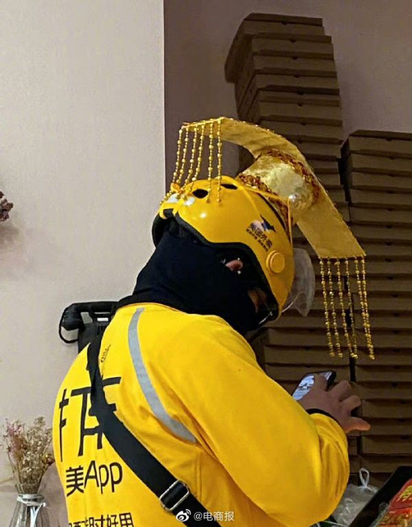这种头饰的外卖小哥是什么等级的?网友:秦始黄,比美团黄高一个等级![允悲]