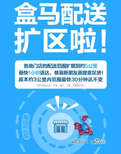 3月底,盒马鲜生宣布扩大覆盖范围,为距离门店3-5公里的区域提供“1小时达”服务。同时,盒马App配送时间也延长至7:30-23:00;