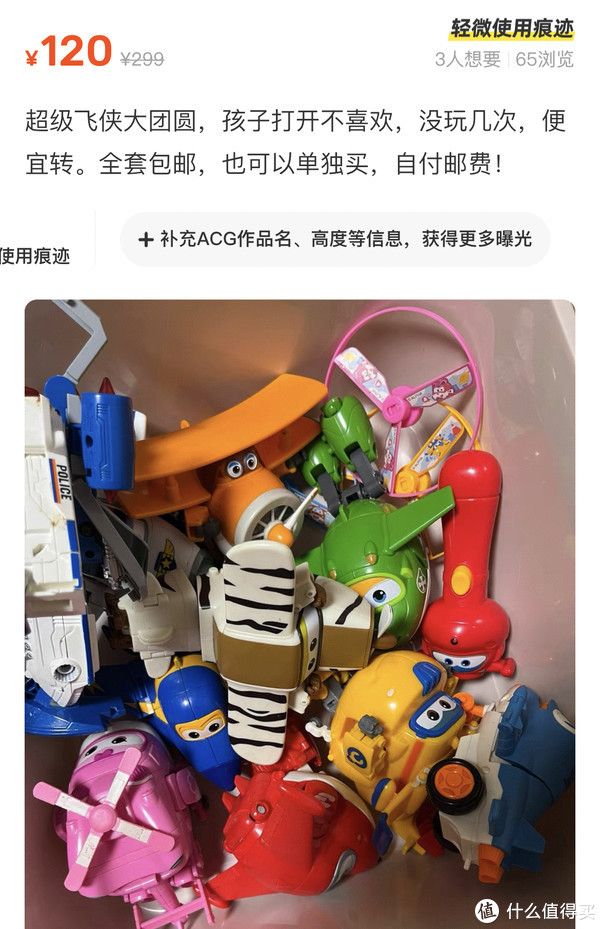 楼主一般出闲置的时候,都会在闲鱼先搜一下同款的大概价格。比如最近卖的这个超级飞侠的正品玩具,楼主搜了一下正价全新30-40元一个,闲鱼最低也要10块钱。楼主这一套12个还包含一些小配件,所以设置了一个120包邮,上架当天就被一个宝妈买走了!