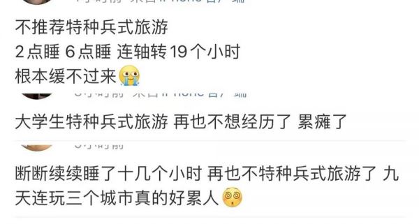 王珂则认为,这样的旅行方式,或许只能短暂“火热”,因为一直这么旅行下去太累了。时代周报记者注意到,在社交媒体上,已经有不少体验过“特种兵式”旅游的人表示不想再经历了:“连轴转19个小时,根本缓不过来”“再也不想经历了,累瘫了”“九天连玩了3个城市,真的好累,再也不特种兵式旅游了。”