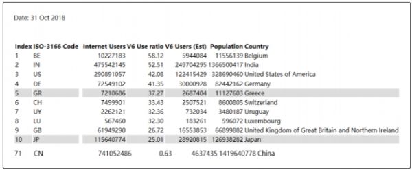 另据权威机构APNIC统计,截至2018年10月31日,全球Ipv6用户率最高的是比利时(58.12%),第二至十位依次是印度(52.51%)、美国(42.08%)、德国(41.35%)、希腊(37.27%)、瑞士(33.43%)、乌拉圭(32.36%)、卢森堡(32.30%)、英国(26.72%)、日本(25.01%)。而中国Ipv6用户率为0.63%,活跃用户为464万户,排名第71位。