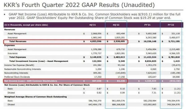 先来梳理KKR最新出炉的2022年第四季度财报。这三个月,KKR的收入从40.5亿美元下降38%至25.3亿美元;净利润为8320万美元,虽然相比去年同期盈利的5亿美元仍有巨大差距,但这一数字与前一季度几近一亿美金的亏损已经有了回调。