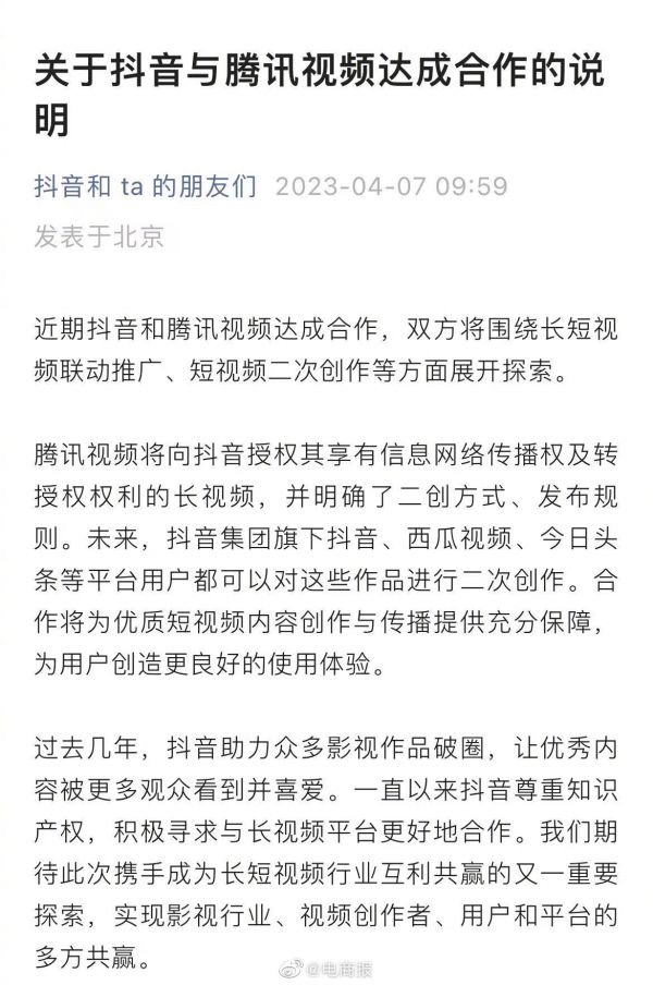 腾讯视频和抖音集团达成合作,长短视频平台合作共赢