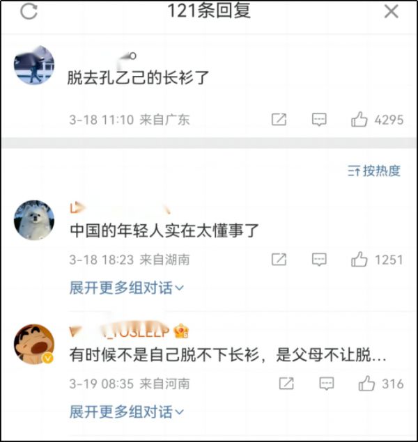 有人阴阳道:“孔乙己终于脱去长衫了。”