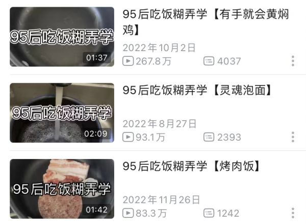 参考过往视频的较高播放量和互动量,后面很快出现了相似的视频系列。比如《留学生生存实录》《打工人带饭糊弄学》《打工人下班如何快速吃上饭?》《00后下班如何快速吃上饭》《做饭而已,水煮到底》等。还有“反面教材”《留学生做饭讲究学》。