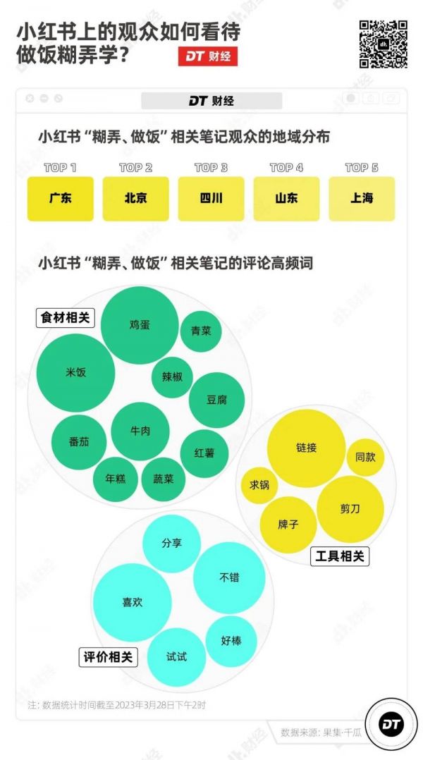 相关数据显示,小红书上以“做饭、糊弄”为关键词的笔记中,受众主要分布在一、二线城市。地域分布TOP 5省份/直辖市中,第一是广东,第二是北京,第五是上海。