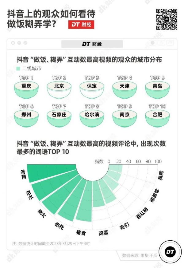 以“做饭、糊弄”主题中互动最高的一条抖音视频为例,视频的观众以二线城市、18~23岁的年轻人为主,观众认为“一锅乱炖”的饭和猪食差不多。评论中的高频词也大多是负面的,比如“依托答辩”(一坨大便的谐音)、“泔水”“猪食”。