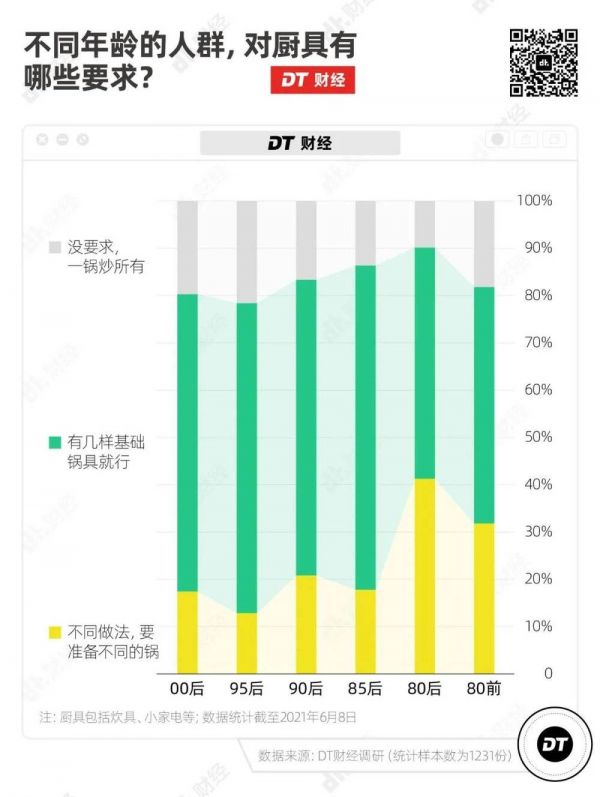 在调研中,有更多00后(63%)和95后(65.7%)觉得厨房里只要有几样基础锅具就行,还有接近2成00后和95后对锅具没要求,可以一锅炒所有。