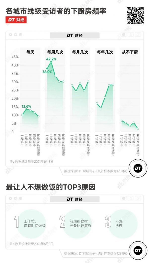 根据DT财经关于年轻人下厨房的调研,在一二线城市中,每周都要做几次饭的年轻人,占比达到48.1和55.8%。
