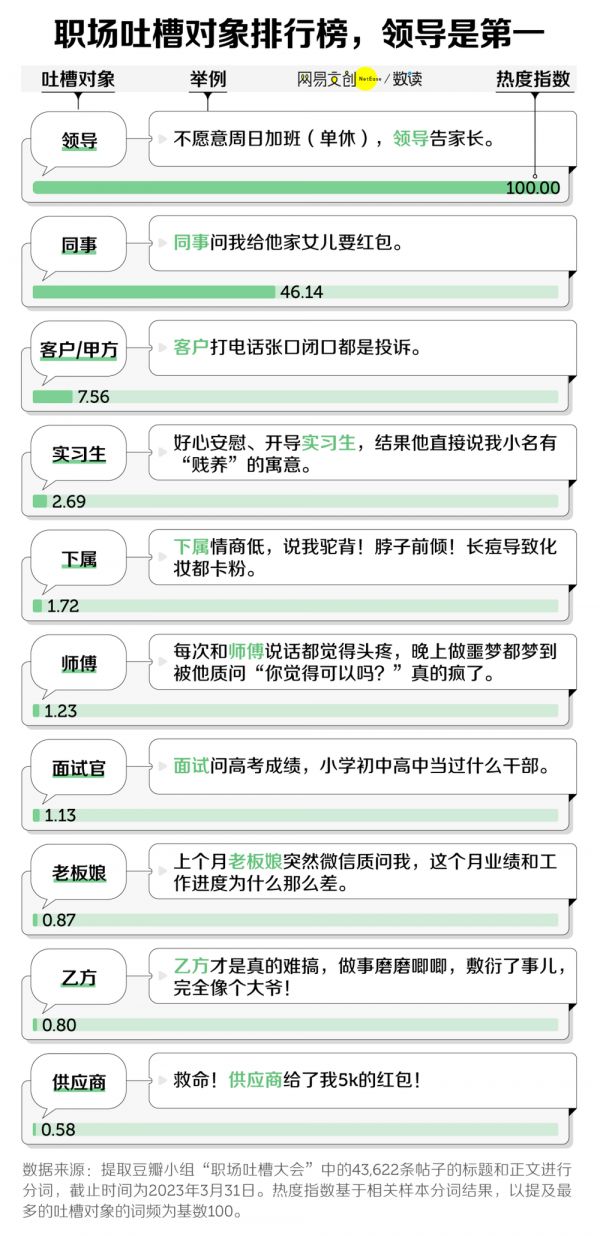 但最令人糟心的,当属掌握着职场生杀大权的领导和抬头不见低头见的同事。其中,领导吐槽指数断层遥遥领先,几乎是同事的两倍还多。
