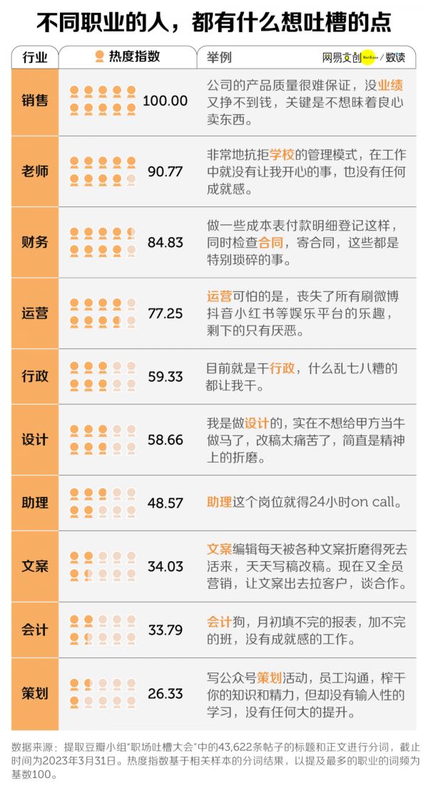 同一个世界,不同的烦恼。吐槽职场的人,来自各个看似光鲜亮丽的行业,实则背后是道不尽的心酸。我们统计了吐槽帖中有关职业的关键词,发现在这些常被吐槽的职业里,文职、财会类的工作名列前茅。