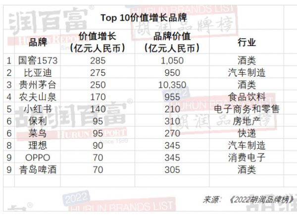 4月3日,胡润发布“2022胡润品牌榜”,“浓香鼻祖”泸州老窖及其高端白酒品牌国窖1573双品牌上榜。其中,国窖1573品牌价值增势亮眼,从285亿元增至1050亿元,是2022年价值增长最多的品牌,排名上升至第九。