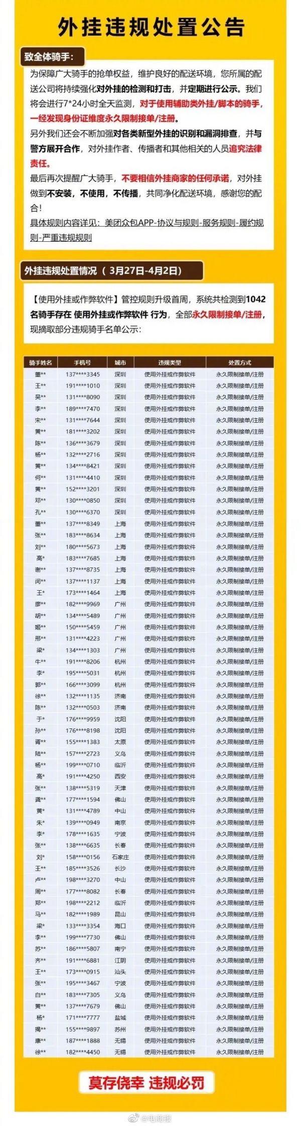 美团发布外挂处置公告,永久封禁1042个违规账号,表明将进行全天候监测,莫存侥幸,违规必罚。