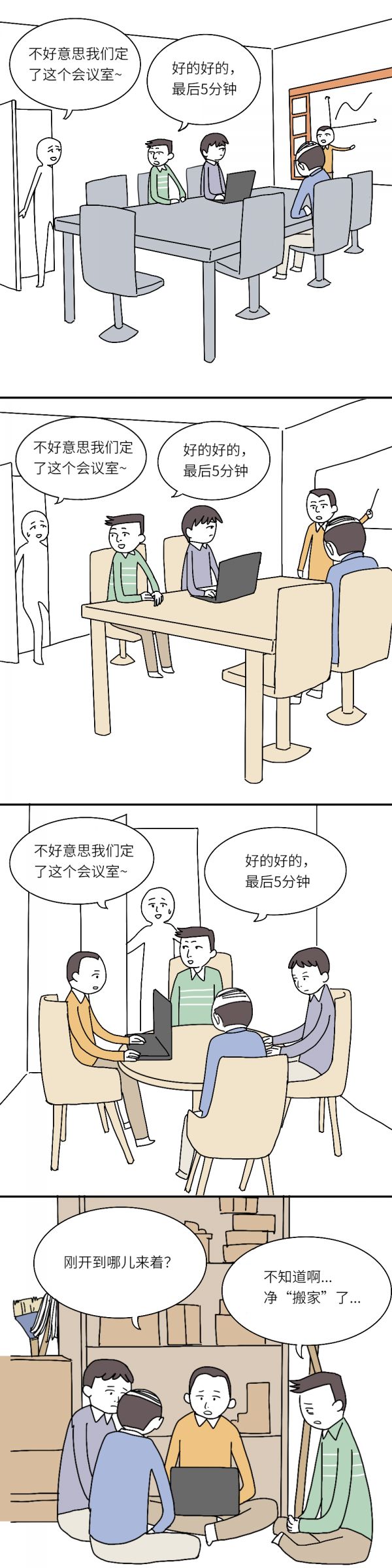 实用小贴士:当一定需要用会议室却实在捡不到漏时。可以考虑去不开放预定的公司里最大的大会议室,一般都没人。当然也可能会议开到一半,会被老板带着高层破门而入。