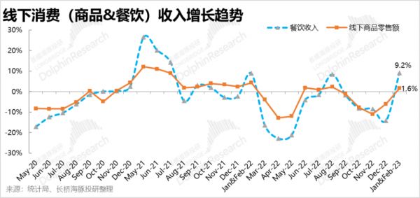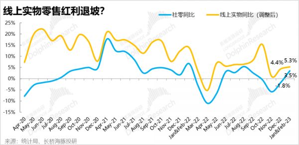 (1)社零总额增速从4Q22的-2.7%快速修复到了+3.5%。与此同时,线上实物零售增速不仅没有提升,反而由4Q的6.4%略微放缓到了5.3%。