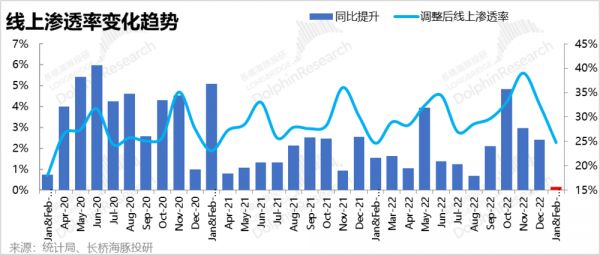 (2)从线上零售渗透率(剔除汽车零售)的角度,今年1~2月渗透率为24.8%,同比提升幅度仅为0.2pct。从下图清晰可见,今年是自新冠以来线上渗透率提升最小的一次(除2021年3月曾因基数过高出现过渗透率同比下降)。