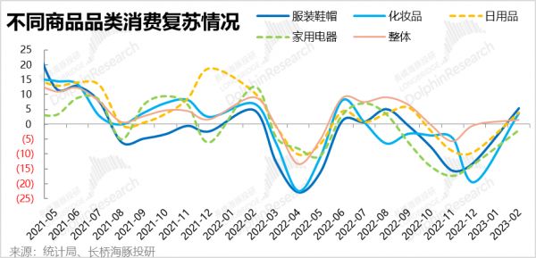 根据1~2月的规模以上社零数据,可选消费中典型的服装鞋帽和化妆品零售增速分别从12月时同比萎缩-12%~-19%,迅速反弹到了+5.4%和+3.8%,明显高于整体1.5%的增速。因此1~2月可选商品消费全渠道消费额的确出现了比较强劲的复苏。