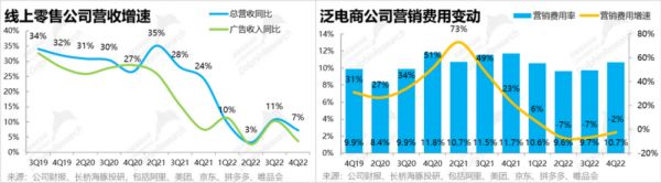 2. 宏观层面的逆风外,电商公司间的竞争格局也超预期的恶化了。4Q的业绩中已初现端倪,4Q泛电商公司整体营销费用同比降幅已从二、三季度时的-7%缩窄到了-2%,可见电商们已在开始重启投入周期,暂时的躺平已经过去。