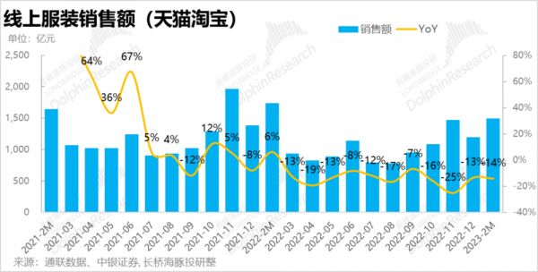 服饰销售上,淘系平台今年1~2月同比也下降了14%,相比上季度同样没有改善。