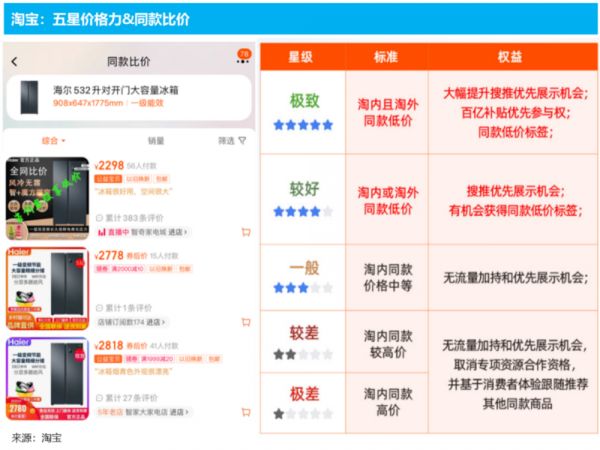 而近期淘宝、京东们推出的“一键比价”,“五星价格力”等低价优先的流量分发策略,则走的是:商家商品价格最低 → 平台给予免费流量倾斜 → 商家薄利但多销 → 低价带来更多用户流量。即商家把买量的费用直接用于价格补贴,以低价吸引自然用户流量,商家和平台都是走量而非价的逻辑。