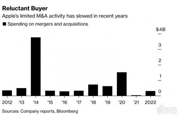 ▲苹果股市情况,来源:彭博社苹果在2022年财年业务收购支出为3.06亿美元,低于2020年的15亿美元,在最新报告的季度中,苹果删除了财务报表中涉及此类活动的项目。苹果并没有进行大规模收购,而是通过股票回购和派息的方式将多余现金返还给股东。