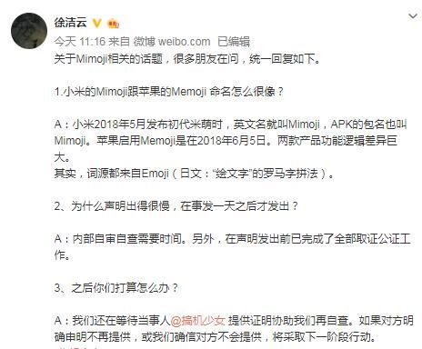 今日上午,小米集团公关部总经理徐洁云再次发布微博,谈到了Mimoji涉嫌抄袭的事情。徐洁云表示,小米2018年5月发布初代米萌时,英文名就叫Mimoji,APK的包名也叫Mimoji。苹果启用Memoji是在2018年6月5日。两款产品功能逻辑差异巨大。其实,词源都来自Emoji(日文:“绘文字”的罗马字拼法)。