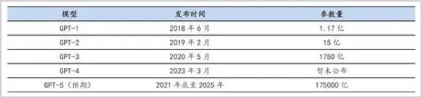 GPT各版本参数量几何式增长。资料来源:OpenAI 官网,安信证券