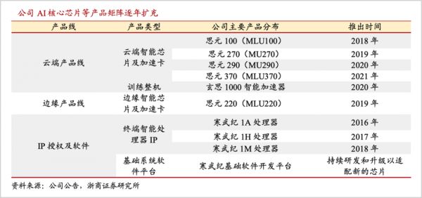 寒武纪产品矩阵涉及云端产品、边缘产品和IP授权及软件,前两者对标英伟达、AMD,IP授权则对应英国的ARM。