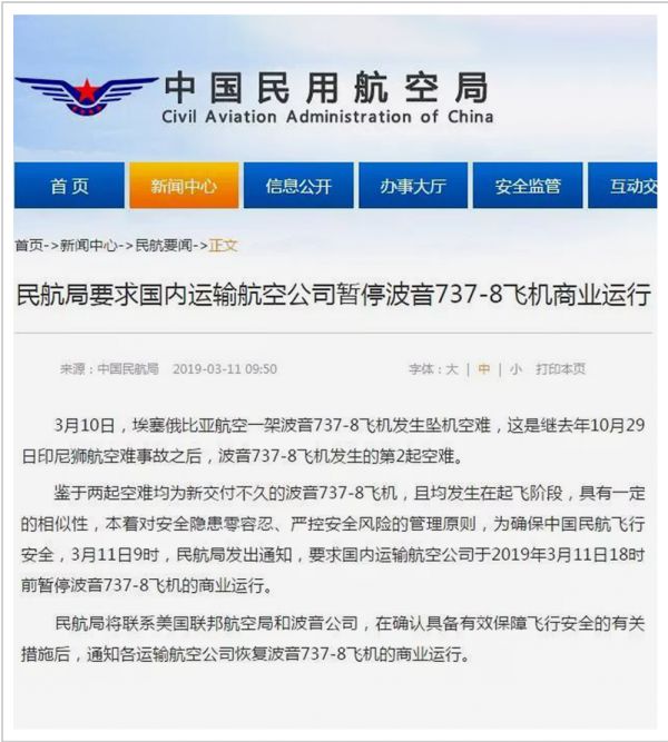 2019年3月10日,波音737MAX8机型在四个多月内发生第二起坠毁事故。第二天,中国民航局首先发布了737MAX8停飞指令。