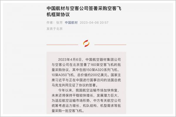4月6日,中国航材与空客签署了160架客机的采购协议,包括150架A320系列飞机,以及10架A350-900宽体飞机。