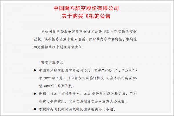 2022年7月1日,中国最大的三家航空公司国航、南航、东航相继发布公告:以合计总价2500亿元人民币,向空客购买292架A320NEO系列飞机。