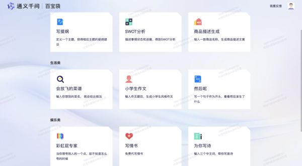 通义千问的“百宝袋”中一共有9款小应用。其中包括,效率类:写提纲、SWOT分析、商品描述生成;生活类:会放飞的菜谱、小学生作文、然后呢;娱乐类:彩虹屁专家、写情书、为你写诗。