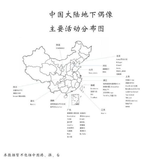 据博主“地下偶像相关揭示板”,截至2022年9月14日,全国(不包括中国港澳台)共有53个“地下偶像团体”,分别分布在北京、上海、广东、四川等12个省市,其中广东以14个团体的数量位列第一,上海紧跟其后。