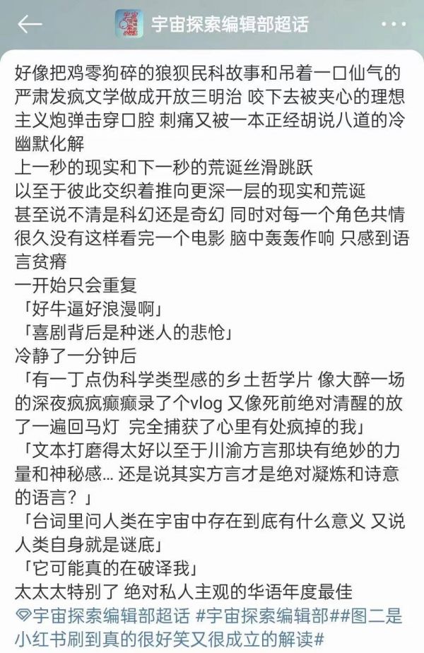 很难形容《宇宙探索编辑部》的气质,导演用恰到好处的幽默消解宇宙的宏大命题,用怪里怪气的台词粉饰赤诚到几乎会被嘲笑的真心,笨拙、偏执、跳动的真心潜藏在简陋的摇晃手持镜头背后。一种火车进隧道了,唐志军还在诉说探寻宇宙意义的执着。那种声音被淹没,但荧幕外我们都听懂了的默契。